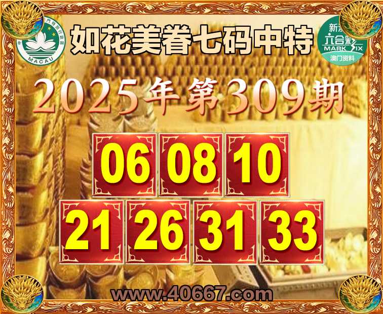 309期:【如花美眷】  ♣️七码中特 ♣️【06.08.10.21.26.31.33】开:06