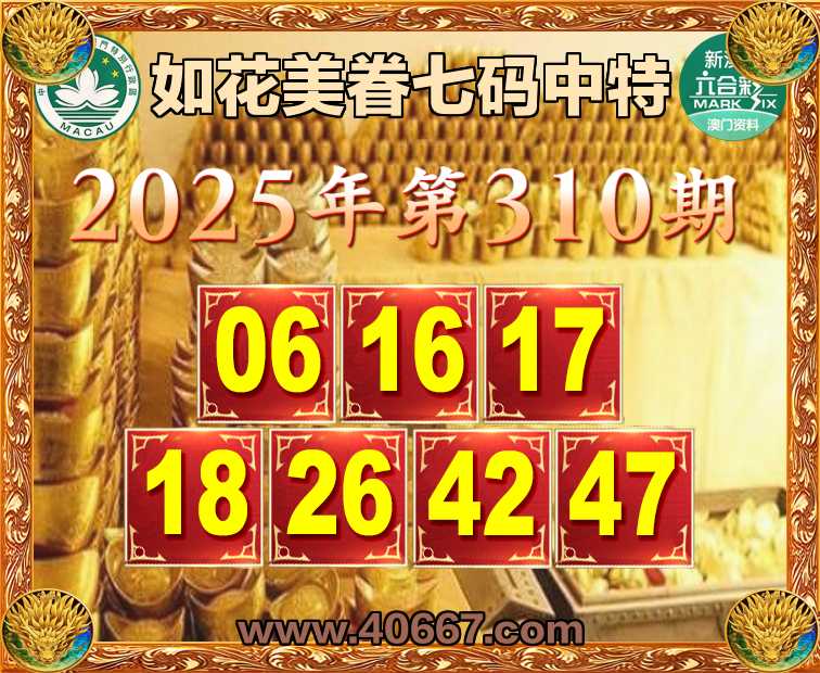 310期:【如花美眷】  ♣️七码中特 ♣️【06.16.17.18.26.42.47】开:16