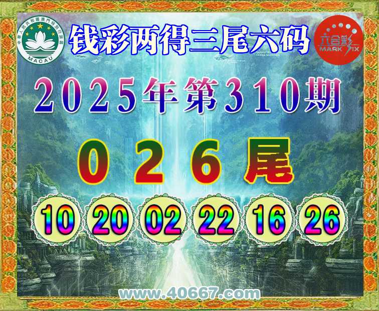310期:【钱彩两得】 👑三尾六码👑【026尾】开:16